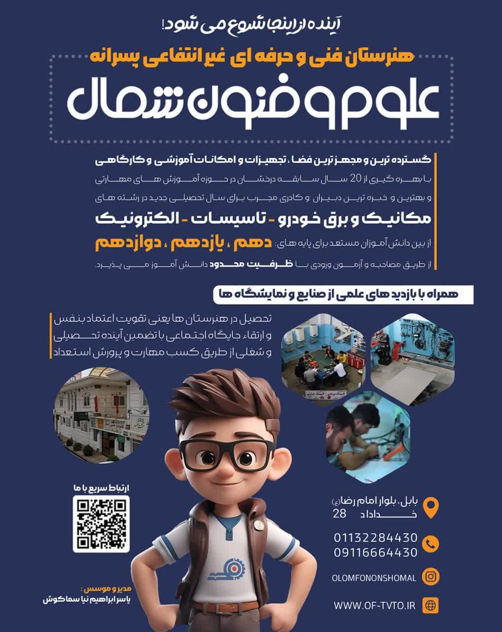 آینده از اینجا شروع می شودهنرستان فنی و حرفه ای غیر دولتی پسرانه علوم و فنون شمال با مجوز رسمی از وزارت آموزش و پرورش در سال 1403 در سه رشته